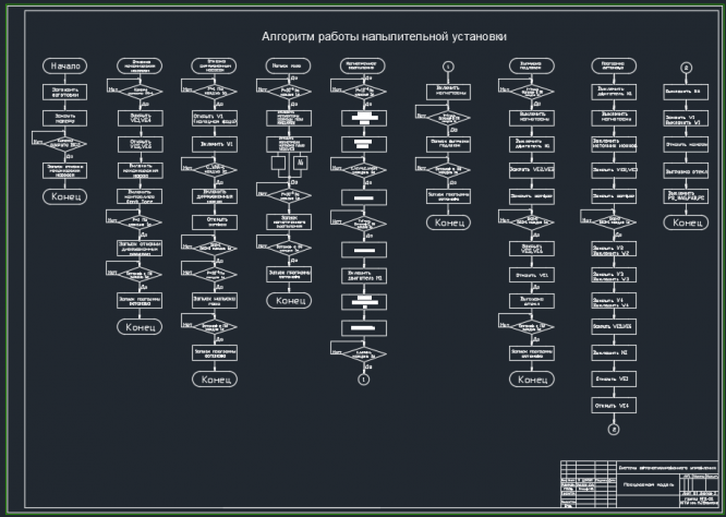 Курсовой проект выполнен в объеме 4 листов А3 и расчетно пояснительной записки. На первом листе приведены алгоритм работы установки и таблицы процессов. На втором и третьем листах – комплесная принципиальная схема установки - механика, энергообеспечение, системы аувтоматического и ручного управления. На четвертом листе представлена электрическая схема блока оптронных развязок. В расчетно-пояснительной записке приведены необходимые пояснения и расчеты, отражены принцыпы построения СУ установки, даны описания листов проекта.