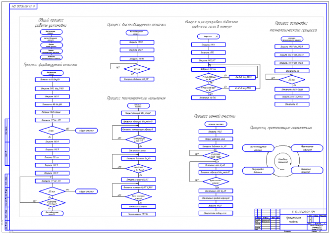1-ый лист (K 13-02.00.00 ПМ) содержит алгоритмы работы процессов. Алгоритмы максимально облегчены для более понятного чтения, в РПЗ содержится подробное описание работы САУ.