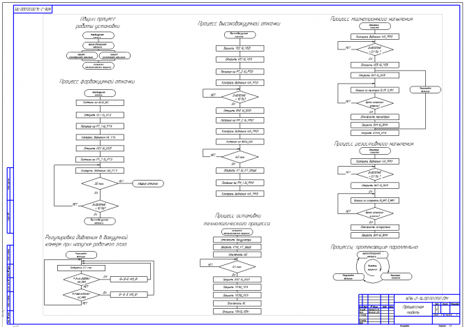 Курсовой проект выполнен в объеме 5-и листов А1 и расчетно-пояснительной записки. На первом листе приведены алгоритм протекания процессов работы установки (процессная модель). На втором, третьем – комплексная принципиальная схема установки. На четвёртом листе - принципиальная схема электрических соединений. На пятом листе – общий вид экрана монитора с управляющей программой. В расчетно-пояснительной записке приведены необходимые пояснения, отражены принципы построения САУ установки, даны описания листов проекта.