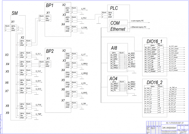Курсовой проект выполнен в объеме ___и листов А1 и расчетно-пояснительной записки. На первом листе приведены алгоритм протекания процессов работы установки, таблица процессов (процессная модель). На втором, третьем – комплексная принципиальная схема установки: механика, энергообеспечение, системы автоматического управления. На четвертом листе - принципиальная схема электрических соединений. На пятом листе – общий вид экрана монитора с управляющей программой. В расчетно-пояснительной записке приведены необходимые пояснения и расчеты, отражены принципы построения СУ установки, даны описания листов проекта.