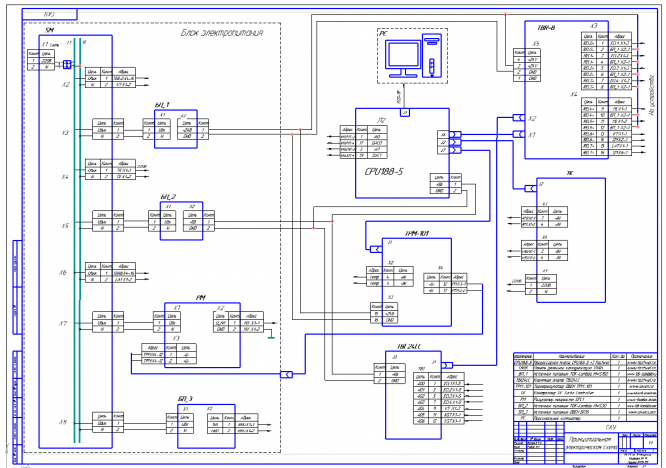 Курсовой проект выполнен в следующем объеме: процессная модель (алгоритмы работы системы управления установкой); комплексная принципиальная схема (КПС) установки, включающая разработку КПС механической части и КПС систем энергообеспечения и управления; схема соединений. В расчетно-пояснительной записке приведены необходимые пояснения, описания и отражены принципы построения САУ установки.