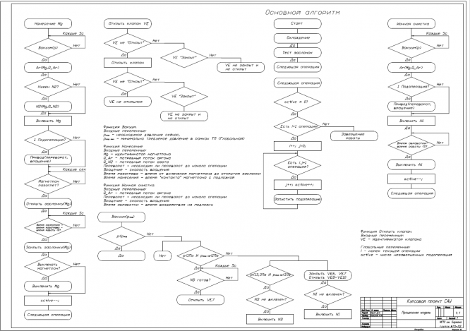 Курсовой проект содержит 5 графических листов, выполненных в програмных пакетах Autodesk AutoCAD Mechanical 2009. Расчетно-пояснительная записка выполнена в Microsoft Word 2003, содержит 36 листов и 30 рисунков. В проекте разработана система автоматического управления установкой нанесения многослойных антифрикционных покрытий.1-ой лист содержат алгоритм работы установки, разбитый на подпроцессы