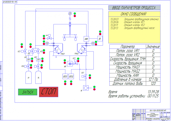 Курсовой проект выполнен в объеме 5-и листов А1 и расчетно-пояснительной записки. На первом листе представлена функциональная схема установки, таблицы сигналов и перечень элементов установки. На втором листе – процессная модель работы установки. На третьем листе – структурная схема. На четвертом листе - схема соединений. На пятом листе – интерфейс оператора. В расчетно-пояснительной записке приведены необходимые пояснения, отражены принципы построения СУ установки, даны описания листов проекта.