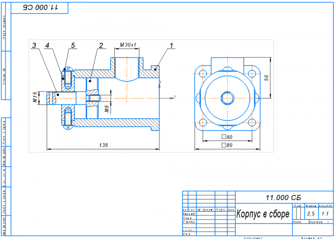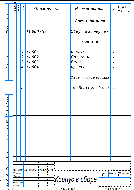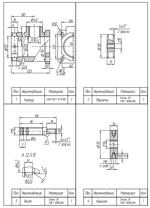 Сборочная единица «Корпус в сборе» содержит четыре детали. На винт 3 навинчивается справа крышка 4 до конца резьбы. Слева на винт навинчивается поршень 2 до упора. Затем эти три соединенные детали устанавливаются в корпусе 1 и крышка 4 соединяется с корпусом четырьмя винтами 5 (М8×16 ГОСТ 17473–80).