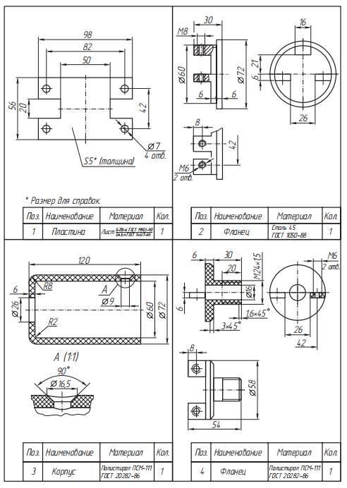 фланцам 2 и 4 четырьмя винтами 5 (М6×12 ГОСТ 17473–80). Затем эти три детали в сборе выкладываются в корпус 3 и соединяются винтом 6 (М8×10 ГОСТ 17475–80).
