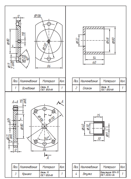 Сборочная единица «Основание в сборе» содержит четыре детали. Втулка 4 крепится к основанию 1 винтом 6 (М8×12 ГОСТ 17473–80). Стакан 2 устанавливается в цилиндрические проточки основания и крышки 3 и закрепляется двумя стягивающими винтами 5 (М10×90 ГОСТ 17475–80), гайками 7 (М10 ГОСТ 5916–70, низкая, Н = 6) и шайбами 8 (10 ГОСТ 11371–80).