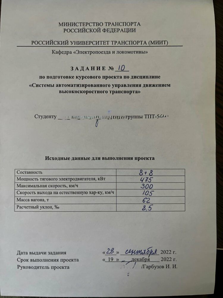 «РОССИЙСКИЙ УНИВЕРСИТЕТ ТРАНСПОРТА (МИИТ)» ИНСТИТУТ ТРАНСПОРТНОЙ ТЕХНИКИ И СИСТЕМ УПРАВЛЕНИЯ Кафедра «Электропоезда и локомотивы» СИСТЕМЫ АВТОМАТИЗИРОВАННОГО УПРАВЛЕНИЯ ДВИЖЕНИЕМ ВЫСОКОСКОРОСТНОГО ТРАНСПОРТА КУРСОВОЙ ПРОЕКТ РАЗРАБОТКА СИСТЕМЫ АВТОМАТИЧЕСКОГО УПРАВЛЕНИЯ СКОРОСТЬЮ ВЫСОКОСКОРОСТНОГО ЭЛЕКТРОПОЕЗДА Составность8+8 Мощность Тягового электродвигателя, кВТ475 Максимальная скорость км/ч300 Скорость выхода на естественную хар-ку км/ч105 Масса вагона, т62 Расчетный уклон, %8,5 .