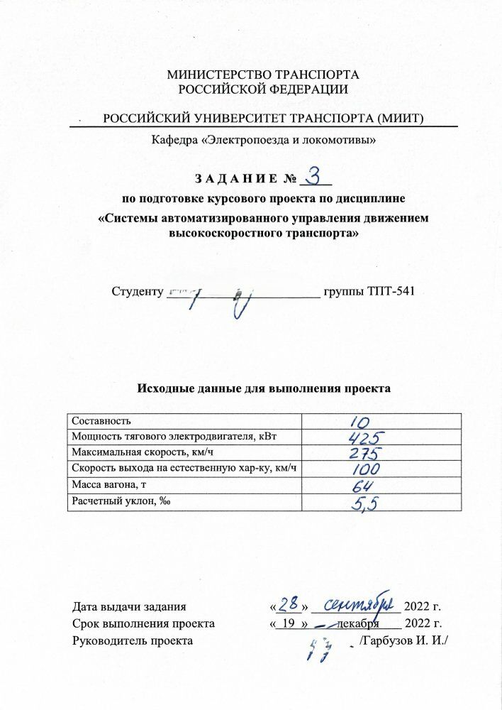 «РОССИЙСКИЙ УНИВЕРСИТЕТ ТРАНСПОРТА (МИИТ)» ИНСТИТУТ ТРАНСПОРТНОЙ ТЕХНИКИ И СИСТЕМ УПРАВЛЕНИЯ Кафедра «Электропоезда и локомотивы» СИСТЕМЫ АВТОМАТИЗИРОВАННОГО УПРАВЛЕНИЯ ДВИЖЕНИЕМ ВЫСОКОСКОРОСТНОГО ТРАНСПОРТА КУРСОВОЙ ПРОЕКТ РАЗРАБОТКА СИСТЕМЫ АВТОМАТИЧЕСКОГО УПРАВЛЕНИЯ СКОРОСТЬЮ ВЫСОКОСКОРОСТНОГО ЭЛЕКТРОПОЕЗДА Составность8 Мощность Тягового электродвигателя, кВТ475 Максимальная скорость км/ч325 Скорость выхода на естественную хар-ку км/ч110 Масса вагона, т66 Расчетный уклон, %9 .