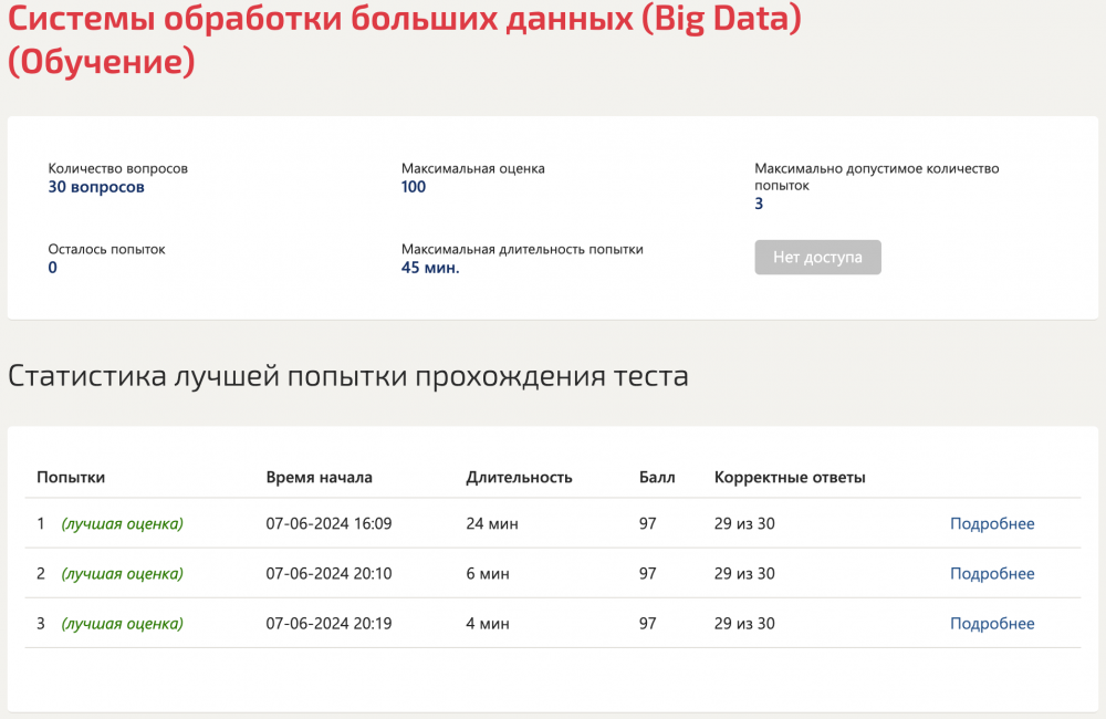 Ответы на тест Системы обработки больших данных (Big Data) для студентов Синергии 5 семестр (вероятно встречается и в других семестрах). Один вопрос повторяется в тесте дважды, а ещё на один вопрос так и не удалось подобрать правильного ответа (видимо в тесте ошибка).