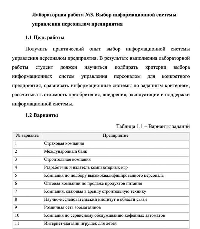 Лабораторная работа 3: Выбор информационной системы управления персоналом предприятия вариант 14