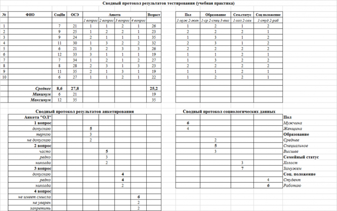 2.Заполнить таблицу. 3.Провести анализ ответов респондентов на вопросы анкеты. 4.Соотнести выделенные группы (возраст, пол, социальное положение и др.) с данными тестирования по методикам «Социальный интерес» и «Оценка самоэффективности». 5.Выдвинуть гипотезы, которые следует обосновать полученными результатами тестирования. 6.Оформить полученные результаты в виде таблиц или графиков (см. пример сводного протокола). 7.Написать выводы. 8.Дать самооценку проведенной работе. 9. 2.Заполнить таблицу. (см. Приложение 1) 3.Провести анализ ответов респондентов. 4.Соотнести выделенные группы (возраст, пол, социальное положение и др.) с данными тестирования по методикам «Социальный интерес» и «Оценка самоэффективности».