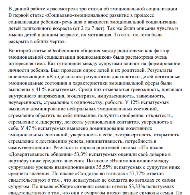 В данной работе я рассмотрела три статьи об эмоциональной социализации. В первой статье «Социально-эмоциональное развитие в процессе социализации ребенка» речь шла о важности эмоциональной социализации детей дошкольного возраста (от 2 до 7 лет). Так же были описаны чувства и мысли детей в данном возрасте, их мотивация. То есть эта тема была раскрыта в общих чертах.