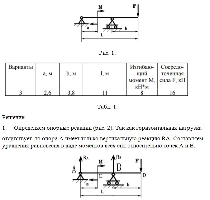 Для студентов ТюмГНГУ по предмету Сопротивление материаловДля заданной схемы балки (рис. 1) требуется определить опорные реакции, построить эпюры изгибающих моментов, найти максимальный момент Мmax и подобратДля заданной схемы балки (рис. 1) требуется определить опорные реакции, построить эпюры изгибающих моментов, найти максимальный момент Мmax и подобрат