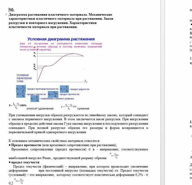 10. Диаграмма растяжения пластичного материала. Механические характеристики пластичного материала при растяжении. Закон разгрузки и повторного нагружения. Характеристики пластичности материала при растяжении.