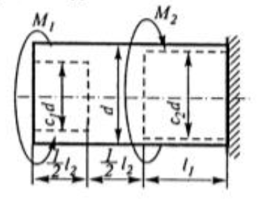 - 2.l1=l2=1 м, c2=0, c1=0,5, G=8*10^11 Па, [τ]=160 МПа, [θ]=0,005 рад/м, M1=1 кНм, M2=1 кНм