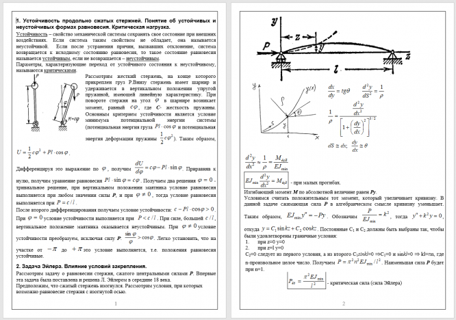 Устойчивость продольно сжатых стержней. Понятие об устойчивых и неустойчивых формах равновесия. Критическая нагрузка. Задача Эйлера. Влияние условий закрепления. Определение критической нагрузки путем интегрирования дифференциального уравнения изогнутой оси. Энергетический метод определения критической нагрузки. Зависимость критического напряжения от гибкости стержня.  Пределы применимости формулы Эйлера. Устойчивость сжатых стержней за пределами пропорциональности. Расчет   продольно   сжатых   стержней   по   коэффициенту   понижения   допускаемого напряжения сжатия. Расчет статически неопределимых стержневых систем методом сил.
