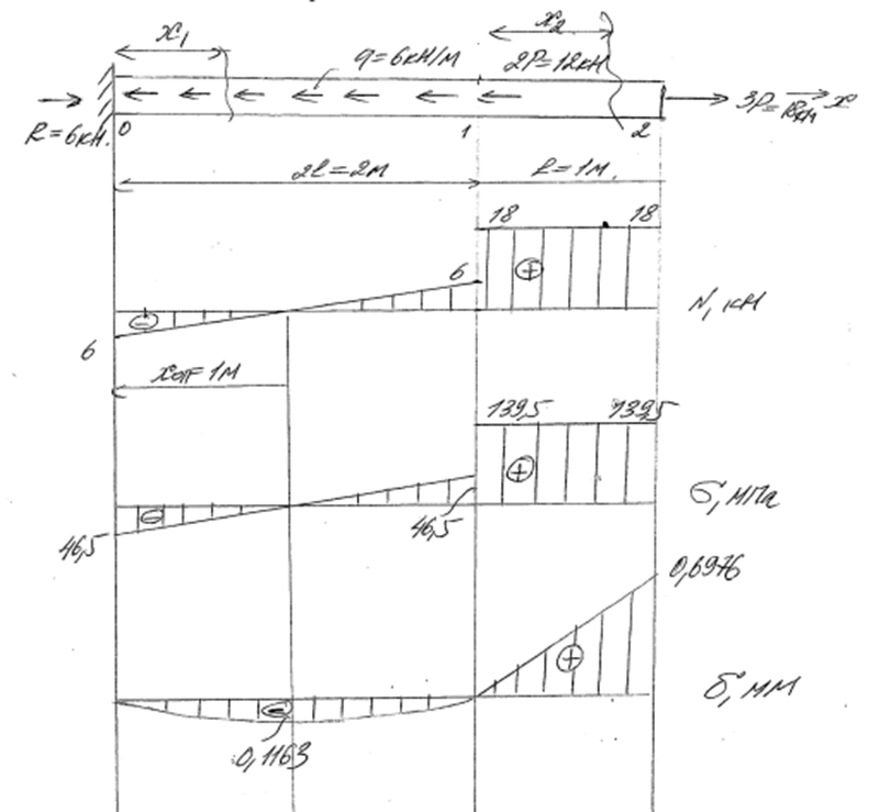 Для стержня требуется построить эпюры распределения продольного усилия и функции перемещений, а также найти максимальное напряжение. Выполнить оценку по условию прочности.