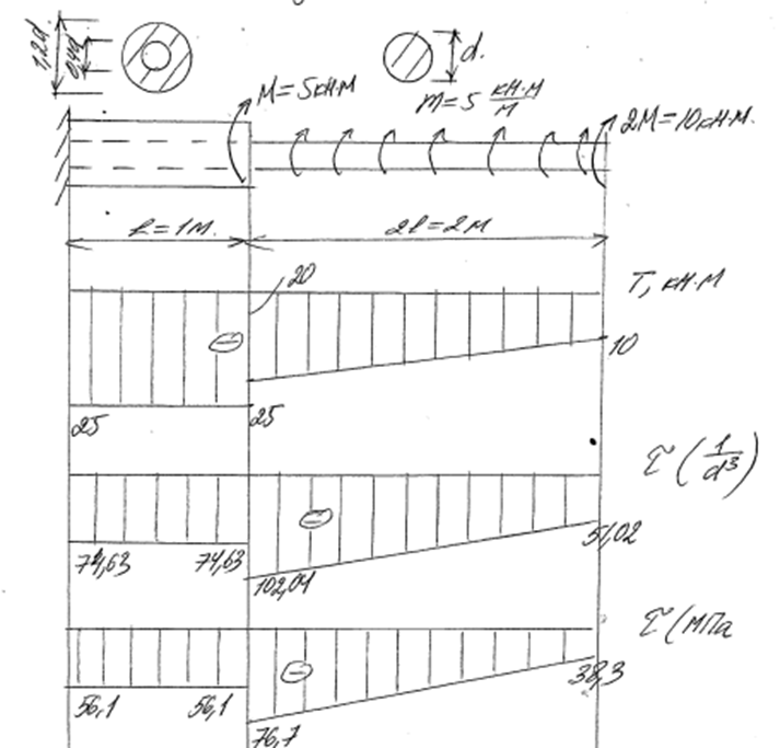 Для ступенчатого стержня необходимо построить эпюру крутящих моментов, эпюру условных касательных напряжений как функцию параметра сечения d, из условия прочности найти искомое значение d.