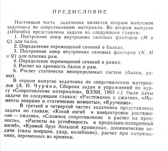 2. Определение перемещений сеч ений в балка х. 3. Построение эпюр вн утренни х силовых ф акторов (N, М и Q) для плоских рам. 4. Определение перемещений сечен ий в ра мах . 5. Расчет на прочность балок и ра м . 6. Расчет статически неопредели мых систе м (балки, рамы). В первом выпуске задачника по сопротив лению мат ер иа лов (А . Н . Чур ин а, Сборник задач и упра жн ений по кур су «Сопротивление материалов», ВЗЭИ , 1963 r.) б ыли даны задачи по следующим главам: «Растяж е ние и сжатие», «Мо менты инерuии и статические моменты», «Кручение». В третьей и четвертой частях задачника пре дста в пены задачи по главам: «Косой изгиб и внеце нтровое растяжение - с~атие», «Сложное сопротивлен и е и расчет на про ч ность », «Расчеты на устойчивость и продольно-попереч ный изгиб>>, «Кривой брус большой кривизны», дин а мические за дачи (силы инерции, удар, колебание) , расчет пр и напряже ниях, переменных во времени.