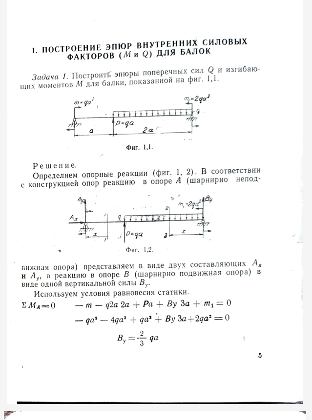 \\ \' r \\ ..... ~ 1. ПОСТРОЕНИЕ ЭПЮР ВНУТРЕННИХ СИЛОВЫХ ФАКТОРОВ ( NI и Q) ДЛЯ БАЛОК Заиача / . П о строи ть э пю ры попер ечны х си л Q и изгиба ющи х м ом с н топ М дл я б ал ки , п о к а з а нно й на ф и г . 1, 1. а Фиг. 1,1. Реш е ние . Оп редел нем опорные реакции ( ф и г . 1, 2). В соотве\'Гс тв ии с 1<онструкцией опор реакцию в о п о ре А (шар н ирн о н епо,1. - А .х Ф иг . 1,2. в ижн а н опор а ) предст а в л яе ~ 1 в в иде д в у х с о ста в ~1я ю щих А~ и А у, а ре а кuию в опоре В (ш а р н и рно - п одвиж н ая о п о р а ) в в иде одной в е рти1<альной си лы В , .. Используем условия равнове~ия ста т и к и . ~МА=О -m-q2a2a + Pa + By3a + m 1 == 0 - qa 2 - 4qa 2 + qa\' + Ву 3a + 2qa2 = О 2 В>\' == -~ qa v 5 ЕМв = О ЕХ=О -А За - rn - Р2а + q2a • а -t· т _ у · 1 - 0 -Ау За - qa2 - qa\'2a + 2qa1 + 2qa2 =::::.