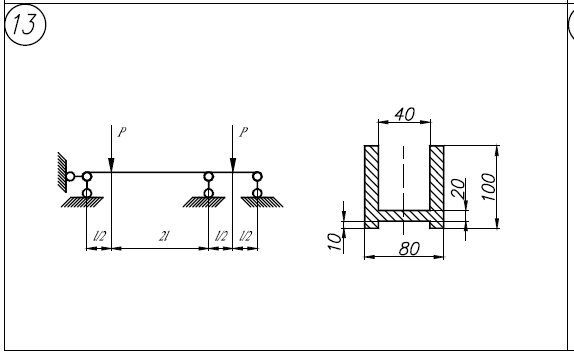1)Произвести расчет балки при упругих деформациях: а)раскрыть статическую неопределимость и построить эпюры Q/y и M/x; б)определить допускаемую нагрузку; в)изобразить примерный вид упругой линии балки. 2)Произвести расчет балки при упруго-пластических деформациях: а)вычислить предельный момент для заданного сечения; б)найти предельную нагрузку для балки и коэффициент запаса; в)определить коэффициент запаса как отношение предельной нагрузки к допустимой нагрузке. Дано: материал балки идеально упруго-пластичный; σ/Т=320МПа; [n]=1,5; l=1м 1)Раскрыть статическую неопределимость и построить эпюру M/изг; 2)Найти линейное перемещение в направлении А-А или угловое перемещение в сечении В.