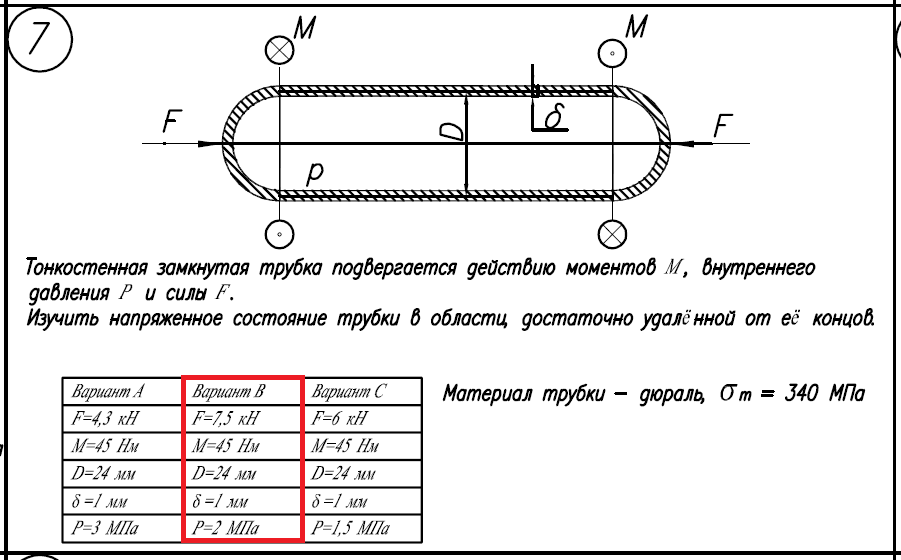 Материал трубки - дюраль, σ/Т=340МПа; Вариант B: F=7,5кН; M=45Нм; D=24мм; δ=1мм; P=2МПа..