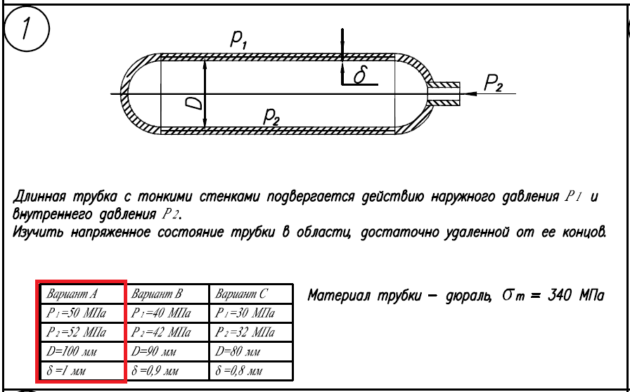 Материал трубки - дюраль, σ/Т=340МПа; Вариант А: P/1=50МПа, P/2=52МПа; D=100мм; δ=1мм..