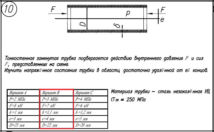 Материал трубки - сталь незакаленная УВ, σ/Т=250МПа; Вариант B: P=3МПа; F=7кН; δ=1,1мм; e=4мм; D=22мм..