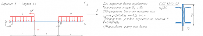 Для заданной балки требуется: 1)Построить эпюры Q/y и M/x. 2)Определить величину нагрузки при σ/Тр=σ/Тсж=240МПа; n/Т=1,5; l=1м 3)Определить угловое перемещение сечения К E=2*105/МПа 4)Нарисовать форму оси балки Для заданной балки требуется: 1)Построить эпюру напряжений в поперечном сечении, изобразив сечение в масштабе 1:1 2)Определить коэффициент запаса по текучести (σ/Т=240МПа) .