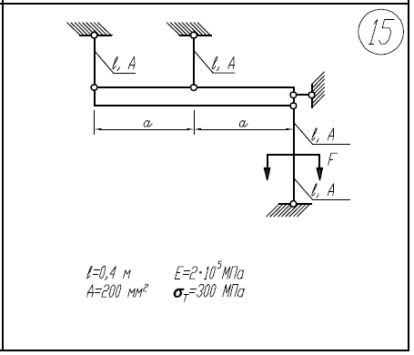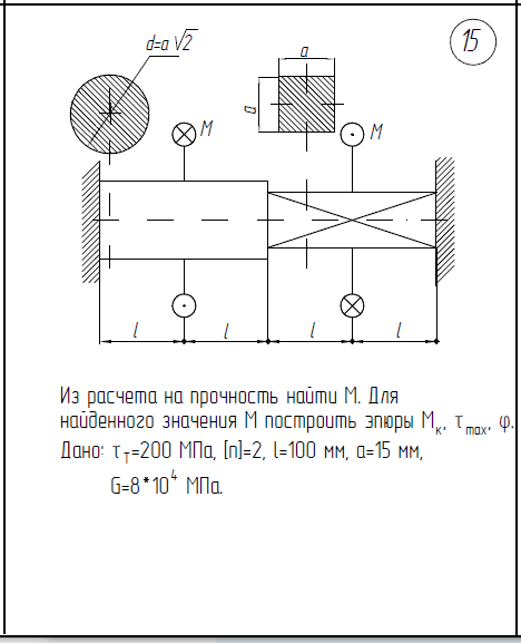 1)Построить эпюры N,σ,w для стержня и трубки при нагревании трубки на ΔT. 2)Определить n/Т. 3)Найти потенциальную энергию системы. A=20мм2/; σ/тст=300МПа; σ/тм=150МПа; l=250мм; E/ст=2*105/МПа; E/ст=2E/м; ΔT=60°С α/м=17*10-6/1/град  1)Определить нагрузку, при которой в стержневой системе возникают первые пластические деформации. 2)Найти напряжения, возникающие в стержнях при найденной нагрузке. l=0,4м; E=2*105/МПа; A=200мм2/; σ/Т=300МПа 1)Из расчета на прочность найти М. 2)Для найденного значения М построить эпюры М/к, τ/max, φ. τ/Т=200МПа; n/Т=2; l=100мм; a=15мм; G=8*104/МПа.