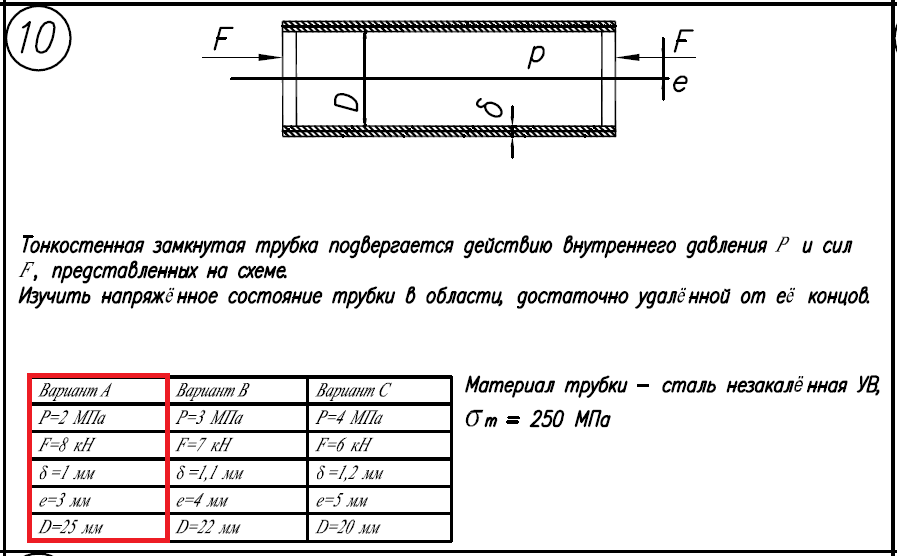 Материал трубки - сталь незакаленная УВ, σ/Т=250МПа; Вариант А: P=2МПа; F=8кН; δ=1мм; e=3мм; D=25мм..