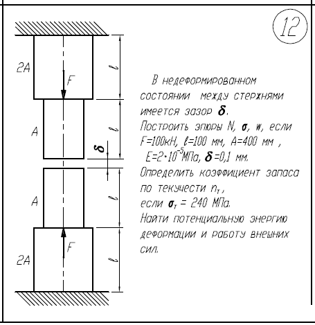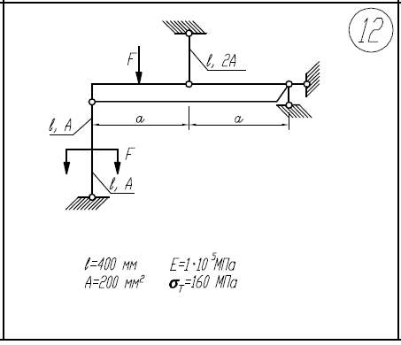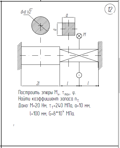 1)В недеформированном состоянии между стержнями имеется зазор δ. 2)Построить эпюры N,σ,w. 3)Определить коэффициент запаса по текучести. 4)Найти потенциальную энергию деформации и работу внешних сил F=100кН; l=100мм; A=400мм2/; E=2*105/МПа; δ=0,1мм; σ/Т=240МПа 1)Определить нагрузку, при которой в стержневой системе возникают первые пластические деформации. 2)Найти напряжения, возникающие в стержнях при найденной нагрузке. l=400мм; E=1*105/МПа; A=200мм2/; σ/Т=160МПа 1)Построить эпюры М/к, τ/max, φ 2)Найти коэффициент запаса n/Т М=20Нм; τ/Т=240МПа; a=10мм; l=100мм; G=8*104/МПа.