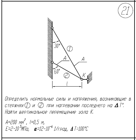 Определить нормальные силы и напряжения, возникающие в стержнях 1 и 2 при нагревании последнего на ΔT°. Найти вертикальное перемещение узла К. А=200мм2/; l=0,5м; E=2*105/МПа; α=12*10-6/1/град ΔT=100°С 1)Определить силу F, при которой в системе возникнут первые пластические деформации. 2)Построить эпюры N,σ,w для стержня и трубки при этом значении силы F. l=500мм; A=400мм2/; E/ст=2*105/МПа; E/м=1*105/МПа; σ/тст=250МПа; σ/тм=150МПа В системе имеется зазор, позволяющий сечению В поворачиваться на угол φ/С=0,0318рад. Построить эпюры М/к, τ/max, φ Вычислить коэффициент запаса по текучести, если: τ/Т=160МПа; d=20мм; l=0,4м=400мм; М=100Нм; G=8*104/МПа.
