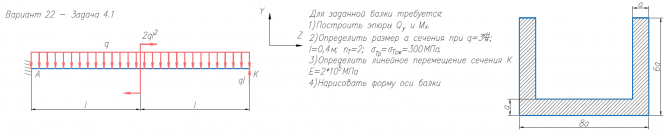 Для заданной балки требуется: 1)Построить эпюры Q/y и M/x. 2)Определить размер а сечения при q=3кН/м; l=0,4м; n/Т=2; σ/Тр=σ/Тсж=300МПа. 3)Определить линейное перемещение сечения К E=2*105/МПа 4)Нарисовать форму оси балки Для заданной балки требуется: 1)Построить эпюру моментов 2)Вычислить наибольшее нормальное напряжение в опасном сечении и определить коэффициент запаса по текучести (σ/Т=240МПа) 3)Построить эпюру нормальных напряжений в опасном сечении, изобразив сечение в масштабе 1:1 .