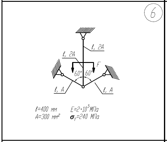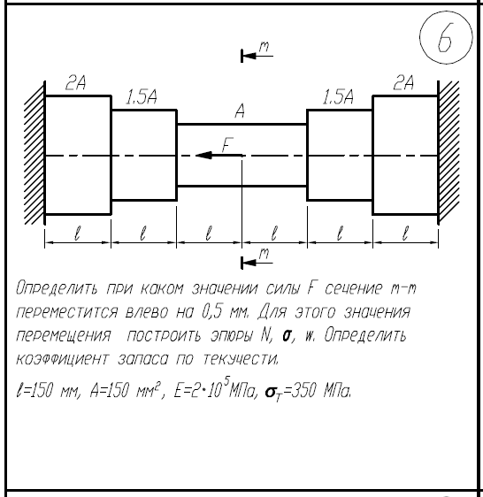 1)Определить при каком значении силы F сечение m-m переместиться влево на 0,5 мм. 2)Для этого значения перемещения построить эпюры N,σ,w. 3)Определить коэффициент запаса по текучести. l=150мм; A=150мм2/; E=2*105/МПа; σ/Т=350МПа 1)Определить нагрузку, при которой в стержневой системе возникают первые пластические деформации. 2)Найти напряжения, возникающие в стержнях при найденной нагрузке. l=400мм; E=2*105/МПа; A=300мм2/; σ/Т=240МПа 1)Построить эпюры М/к, τ/max, φ 2)Из расчета на прочность найти размер d М=100Нм; [τ]=60МПа; l=200мм; G=8*104/МПа.