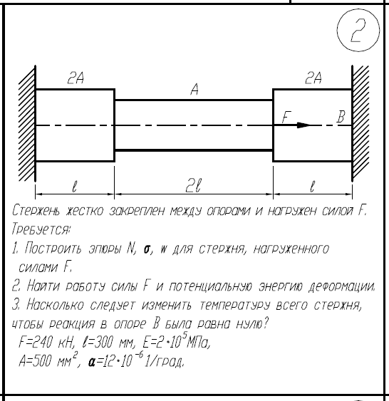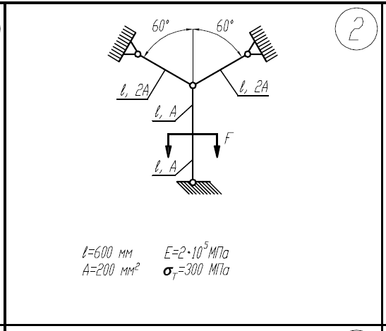 1)Построить эпюры N,σ,w для стержня, нагруженного силами F. 2)Найти работу силы F и потенциальную энергию деформации. 3)Насколько следует изменить температуру всего стержня, чтобы реакция в опоре В была равна нулю? F=240кН; l=300мм; E=2*105/МПа; A=500мм2/; α=12*10-6/1/град 1)Определить нагрузку, при которой в стержневой системе возникают первые пластические деформации. 2)Найти напряжения, возникающие в стержнях при найденной нагрузке. l=600мм; E=2*105/МПа; A=200мм2/; σ/Т=300МПа   1)Построить эпюры М/к, τ/max, φ 2)Из расчета на прочность найти размер d М=100Нм; τ/Т=80МПа; l=100мм; G=8*104/МПа.