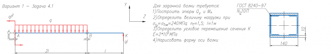 Для заданной балки требуется: 1)Построить эпюры Q/y и M/x. 2)Определить величину нагрузки при σ/Тр=σ/Тсж=240МПа; n/Т=1,5; l=1м 3)Определить угловое перемещение сечения К E=2*105/МПа 4)Нарисовать форму оси балки Для заданной балки требуется: 1)Построить эпюру напряжений в поперечном сечении, изобразив сечение в масштабе 1:1 2)Определить коэффициент запаса по текучести (σ/Т=240МПа).