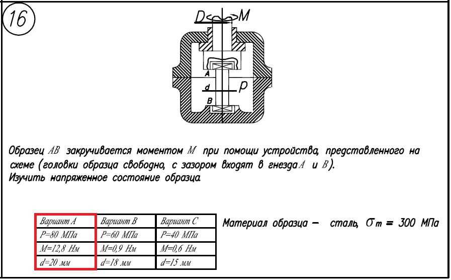 Изучить напряженное состояние образца. Материал образца - сталь, σ/Т=300МПа; Вариант А: P=80МПа; M=12,8Нм; d=20мм.
