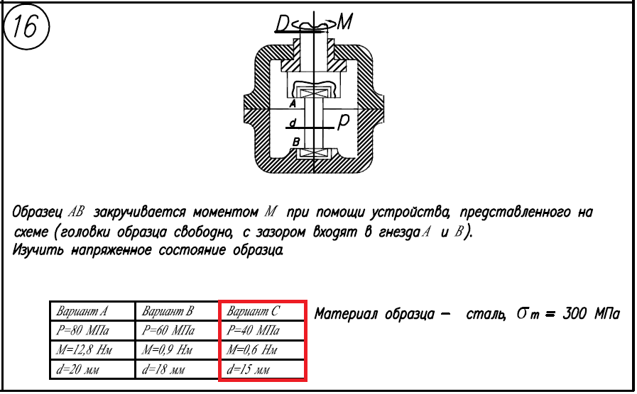 Изучить напряженное состояние образца. Материал образца - сталь, σ/Т=300МПа; Вариант C: P=40МПа; M=0,6Нм; d=15мм.