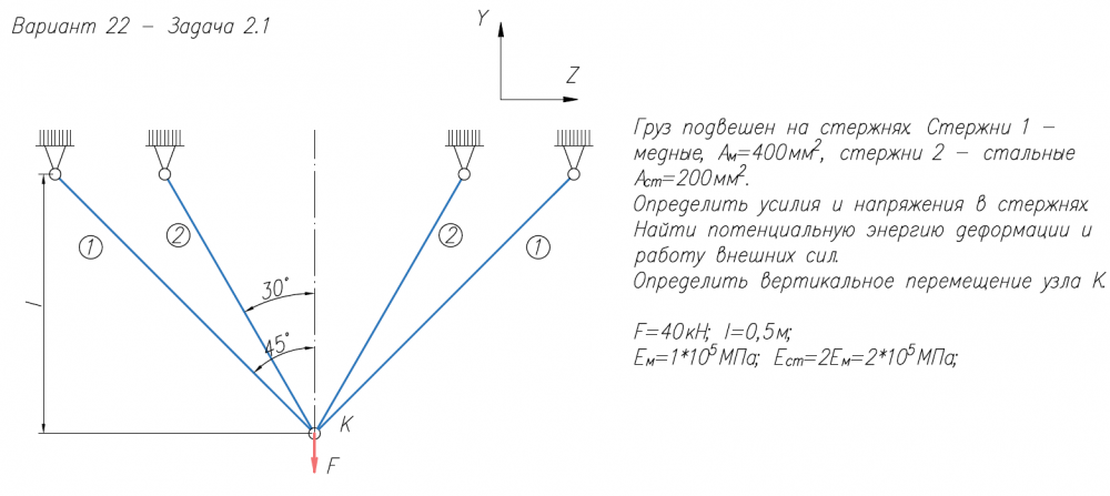 Груз подвешен на стержнях. Стержни 1 - медные, А/м=400мм2/, стержни 2 - стальные А/ст=200мм2/. Определить усилия и напряжения в стержнях. Найти потенциальную энергию деформации и работу внешних сил. Определить вертикальное перемещение узла К. F=40кН; l=0,5м; E/м=1*105/МПа; E/ст=2E/м=2*105/МПа;  1)Определить силу F, при которой в системе возникнут первые пластические деформации. 2)Построить эпюры N,σ,w для стержня и трубки при этом значении силы F. l=400мм; A=500мм2/; E/ст=2*105/МПа; E/м=1*105/МПа; σ/тст=320МПа; σ/тм=160МПа В системе имеется зазор, позволяющий сечению C поворачиваться на угол φ/С=0,064рад. Построить эпюры М/к, τ/max, φ Вычислить коэффициент запаса по текучести, если: τ/Т=200МПа; d=25мм; l=0,5м=500мм; М=200Нм; G=8*104/МПа.