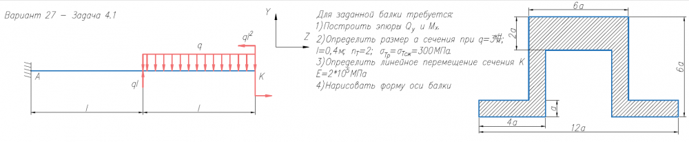 Для заданной балки требуется: 1)Построить эпюры Q/y и M/x. 2)Определить размер а сечения при q=3кН/м; l=0,4м; n/Т=2; σ/Тр=σ/Тсж=300МПа. 3)Определить линейное перемещение сечения К E=2*105/МПа 4)Нарисовать форму оси балки Для заданной балки требуется: 1)Построить эпюру напряжений в поперечном сечении, изобразив сечение в масштабе 1:1 2)Определить коэффициент запаса по текучести (σ/Т=240МПа)  .
