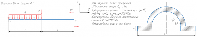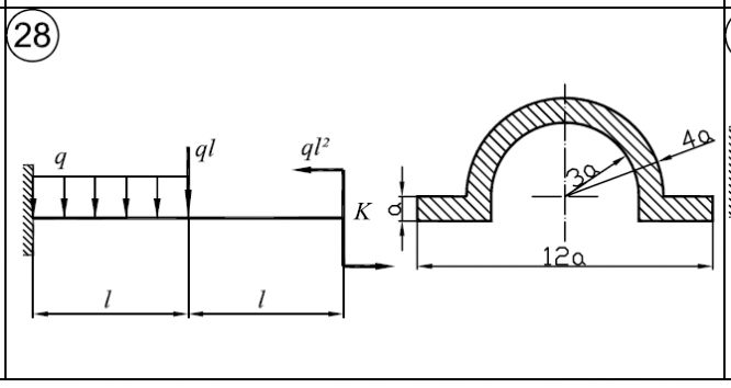 Для заданной балки требуется: 1)Построить эпюры Q/y и M/x. 2)Определить размер а сечения при q=3кН/м; l=0,4м; n/Т=2; σ/Тр=σ/Тсж=300МПа. 3)Определить линейное перемещение сечения К E=2*105/МПа 4)Нарисовать форму оси балки Для заданной балки требуется: 1)Построить эпюру моментов 2)Вычислить наибольшее нормальное напряжение в опасном сечении и определить коэффициент запаса по текучести (σ/Т=240МПа) 3)Построить эпюру нормальных напряжений в опасном сечении, изобразив сечение в масштабе 1:1 .