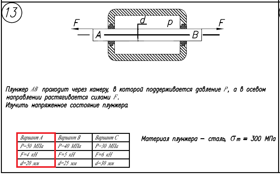Материал плунжера - сталь, σ/Т=300МПа Вариант А: P=50МПа; F=4кН; d=20мм..