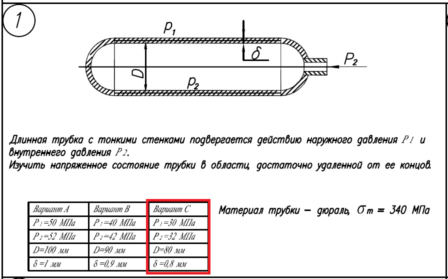 Материал трубки - дюраль, σ/Т=340МПа; Вариант C: P/1=30МПа, P/2=32МПа; D=80мм; δ=0,8мм..