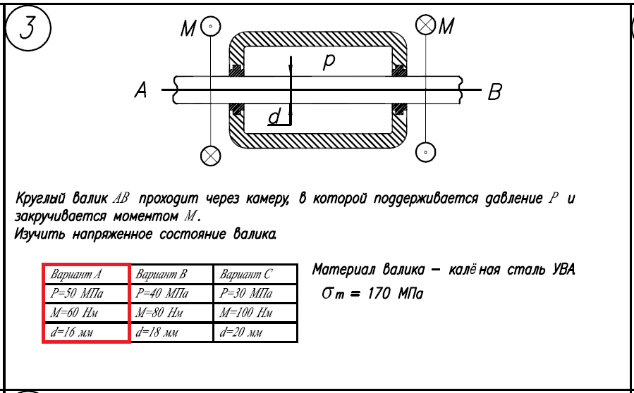 Задача 6.1 Построить эпюры изгибающих M/изг и крутящих M/кр моментов отдельно для каждой силы и от совместного действия этих сил. 2)Определить размеры поперечных сечений, если: F=1кН; l=200мм, σ/Т=300МПа; n/Т=2. 3)Определить диаметр равнопрочного круглого сечения. Задача 6.2. Для деталей, изображенных на чертежах и указанных в тексте задач, требуется: 1)Определить напряженное состояние в наиболее нагруженных точках. 2)Исследовать напряженное состояние в этих точках аналитически и графически. 3)Определить коэффициент запаса. Круглый валик AB проходит через камеру, в которой поддерживается давление P и закручивается моментом M. Изучить состояние валика. Материал валика - каленая сталь УВА, σ/Т=170МПа; Вариант А: P=50МПа; M=60Нм; d=16мм..