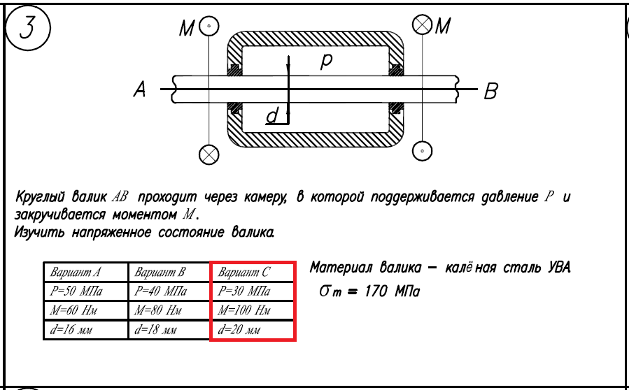 Задача 6.1 Построить эпюры изгибающих M/изг и крутящих M/кр моментов отдельно для каждой силы и от совместного действия этих сил. 2)Определить размеры поперечных сечений, если: F=1кН; l=200мм, σ/Т=300МПа; n/Т=2. 3)Определить диаметр равнопрочного круглого сечения. Задача 6.2. Для деталей, изображенных на чертежах и указанных в тексте задач, требуется: 1)Определить напряженное состояние в наиболее нагруженных точках. 2)Исследовать напряженное состояние в этих точках аналитически и графически. 3)Определить коэффициент запаса. Круглый валик AB проходит через камеру, в которой поддерживается давление P и закручивается моментом M. Изучить состояние валика. Материал валика - каленая сталь УВА, σ/Т=170МПа; Вариант C: P=30МПа; M=100Нм; d=20мм..
