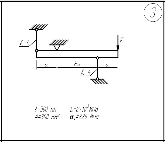 1)Построить эпюры N,σ,w для стержня, нагруженного силами F. 2)Подсчитать коэффициент запаса по текучести. *Стержень нарисован в недеформированном состоянии F=150кН; l=100мм; E=2*105/МПа; A=300мм2/; δ=0,1мм; σ/Т=300МПа 1)Определить нагрузку, при которой в стержневой системе возникают первые пластические деформации. 2)Найти напряжения, возникающие в стержнях при найденной нагрузке. l=500мм; E=2*105/МПа; A=300мм2/; σ/Т=220МПа 1)Построить эпюры М/к, τ/max, φ 2)Найти коэффициент запаса n/Т М=40Нм; τ/Т=240МПа; d=10мм; l=200мм; G=8*104/МПа D=2d; δ=d/16.