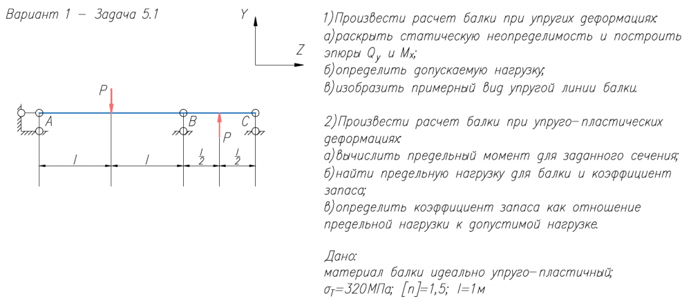 1)Произвести расчет балки при упругих деформациях: а)раскрыть статическую неопределимость и построить эпюры Q/y и M/x; б)определить допускаемую нагрузку; в)изобразить примерный вид упругой линии балки. 2)Произвести расчет балки при упруго-пластических деформациях: а)вычислить предельный момент для заданного сечения; б)найти предельную нагрузку для балки и коэффициент запаса; в)определить коэффициент запаса как отношение предельной нагрузки к допустимой нагрузке. Дано: материал балки идеально упруго-пластичный; σ/Т=320МПа; [n]=1,5; l=1м 1)Раскрыть статическую неопределимость и построить эпюру M/изг; 2)Найти линейное перемещение в направлении А-А или угловое перемещение в сечении В.
