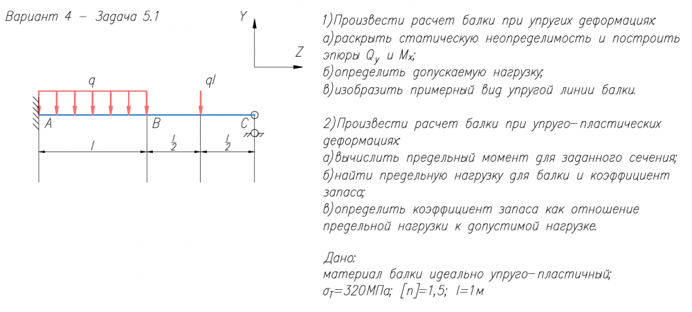 1)Произвести расчет балки при упругих деформациях: а)раскрыть статическую неопределимость и построить эпюры Q/y и M/x; б)определить допускаемую нагрузку; в)изобразить примерный вид упругой линии балки. 2)Произвести расчет балки при упруго-пластических деформациях: а)вычислить предельный момент для заданного сечения; б)найти предельную нагрузку для балки и коэффициент запаса; в)определить коэффициент запаса как отношение предельной нагрузки к допустимой нагрузке. Дано: материал балки идеально упруго-пластичный; σ/Т=320МПа; [n]=1,5; l=1м 1)Раскрыть статическую неопределимость и построить эпюру M/изг; 2)Найти линейное перемещение в направлении А-А или угловое перемещение в сечении В.
