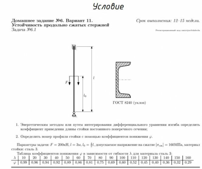 В файле зачтенное ДЗ-3 Устойчивость продольно сжатых стержней , решенное методом интегрирования ДУ , номер профиля стойки также определен. Сделано в ворде, все подробно. Условие ниже